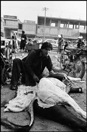 AFGHANISTAN. Kabul. 2010. Butcher skinning cowÕs carcass in open...