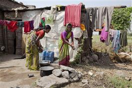 INDIA. 2009. Outside Aurangabad. Women wash hands from bagging...