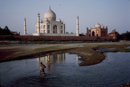 INDIA. Taj Mahal, 1999. Men walking in water in front of the...