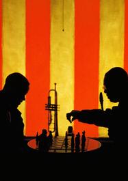 USA. San Francisco, CA. 1960. Beatniks. Roger Sommers silhouetted...