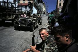 GRENADA. St. George. 1983. U.S. soldiers man a roadblock during...