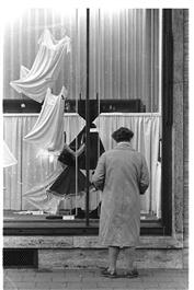 GERMANY, EAST BERLIN, 1961. Women window shops Lingerie store...