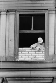 GERMANY, WEST BERLIN,1961. East German workman bricking up window...