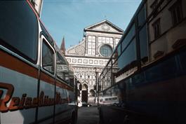 Italy, Florence: tourist buses near the church of St. Maria Novella....