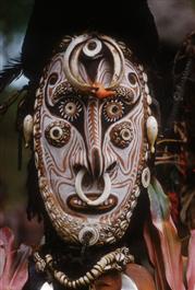 NEW GUINEA. Goroka. 1960. Carved Sepik River wooden mask on display...