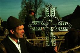 POLAND. Village of Nowy Targ, near Zakopane. Man carrying a crucifix...