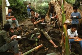 PHILIPPINES. Negros. 1986. NPA squad eating at campsite in mountains...