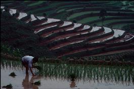 Near Loshan.A farmer plants rice on a terraced paddy.