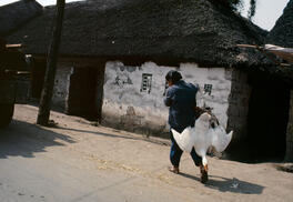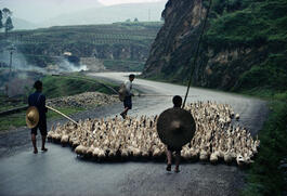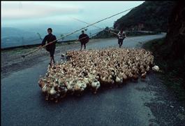 CHINA. Sichuan. Chengdu. 1980. Ducks are led down a paved country...