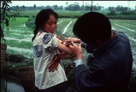 Near Loshan. A "bare-foot" doctor giving an injection to a worker...