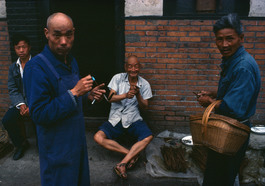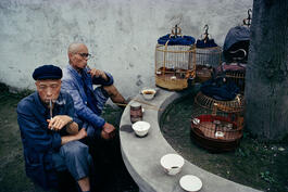CHINA. Sichuan. Chengdu. 1980. Old men and their birds, in a...