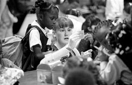 U.S.A., New York, New York, 1998. Volunteer worker helping children...