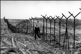 For the nomadic Bedouin tribesmen and their families living in the Sinai desert, the completion of a new barbed wire frontier fence from Gaza through to the Suez Canal, which is being completed for the April 1982 new territories agreements, is cutting their land in two. Israeli military units are putting the finishing touches to this borderline near Rafah, between Egypt and Israel.February 1982.