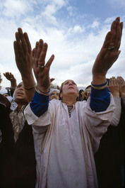 INDIA. A woman praying in the Grand Mosque of Jama Masjid in...