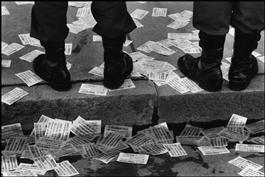 CHILE. Santiago. Riot police stand on leaflets protesting against...