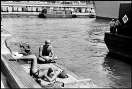 USA. New York City. Sun lovers on the Morton Street Pier at the...