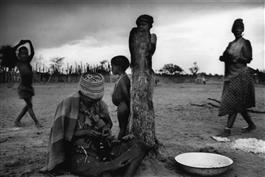 NAMIBIA. Bushman family warm themselves by a fire near Tsumkwe....
