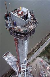 Construction of the Pont de Normandie (Normandy Bridge). The world's largest cable stayed bridge, located on the Estuary of the Seine between the ports of Honfleur and Le Havre. It will become an important commercial european axis. It will link with the international port of Le Havre, with the Cross Chanel Tunnel and with the major highway A.29 connecting with Spain.