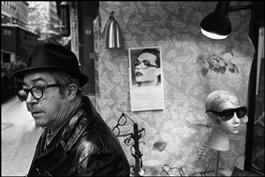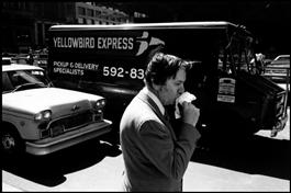 USA. New York. Bleecker Street. Man on his knees outside a diner....