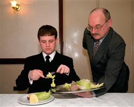 GB. ENGLAND London. Butler School. Student butlers practice the...