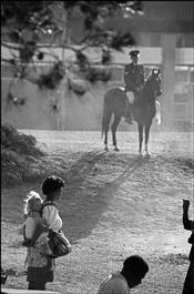 South Africa. Ventersdorp. Police wearing gas masks face up...