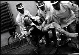 JAPAN. Sanya. 1996. Homeless man being carried away into an ambulance....