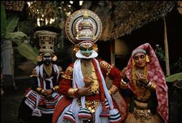 Cochin. Kathakali dancer performing in a temple courtyard.