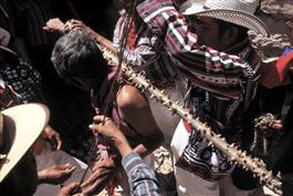 Quiché. San Andrés Sajcabajá. 1997. A man wears leg irons during...