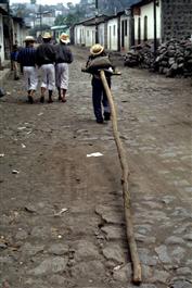 Santiago Atitlán. 1997. A man carries a pole to his home.