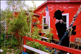 USA. Maine. Cundy's Harbour. Wooden cutout sign of a man smoking...