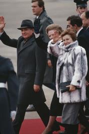 GB. London. Mikhail Gorbachev stops to greet Margaret Thatcher...