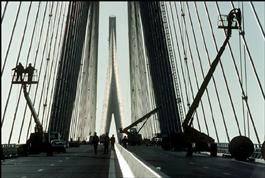 Construction of the Pont de Normandie (Normandy Bridge). The world's largest cable stayed bridge, located on the Estuary of the Seine between the ports of Honfleur and Le Havre. It will become an important commercial european axis. It will link with the international port of Le Havre, with the Cross Chanel Tunnel and with the major highway A.29 connecting with Spain.