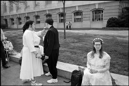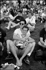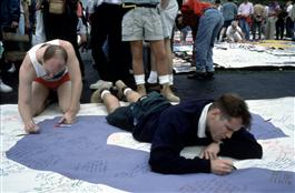 USA. Washington, D.C. 1993. Men sign the AIDS quilt.