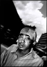 JAPAN. Shinjuku. 1999. An injured homeless man wears a bandage...