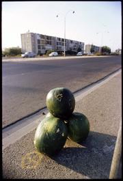 Tel Aviv, a watermelon vendor along Hashalom Road,near a housing...