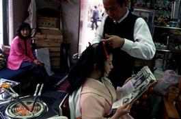 Japan. Kyoto. Maiko-san have their hair done weekly. The treatment...