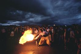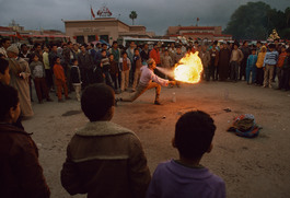 MOROCCO. Marrakech. 1988. Street performer eating and breathing...