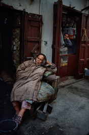MOROCCO. 1988. A man sits in a shoe store alone.