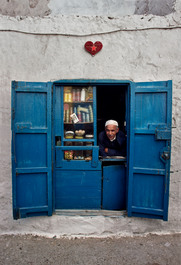 MOROCCO. 1988. A candy vendor in Morocco sits in his stall.