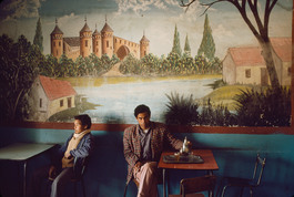 MOROCCO. 1988. Two men sit beneath a painting of palms trees....