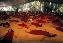 INDIA. The Buddha Hall, meditation and releasing tension session,...