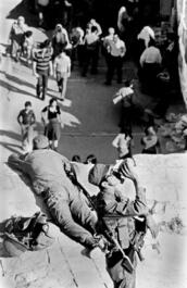 ISRAEL. Jerusalem. 1976. Armed soldiers sit atop an old wall...