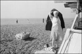 ENGLAND. Brighton. 1960. Woman in black on stone beach.