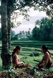 INDONESIA. Bali. Two young Balineese girls rest by rice paddies...