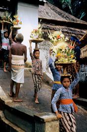 BALI. 1953. Offerings to the gods of the Temple of Ubud are carried...