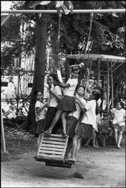 LAOS. Vientiane. July 1975. Laughing girls on a swing.