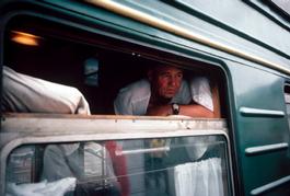 USSR. Russia. Tourists arrive from north by train, to Sochi station....