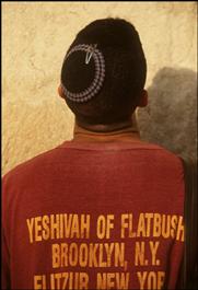 ISRAEL. Jerusalem. 1996. A Hassid Jews fit Tefelin to a young...
