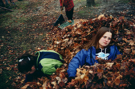 CANADA. Ile d'Orleans, Quebec. 2000. Raking and playing in the...