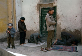 CHINA. Xinjiang. Kashgar. 1989. Uygur men leaving the Id Kah...